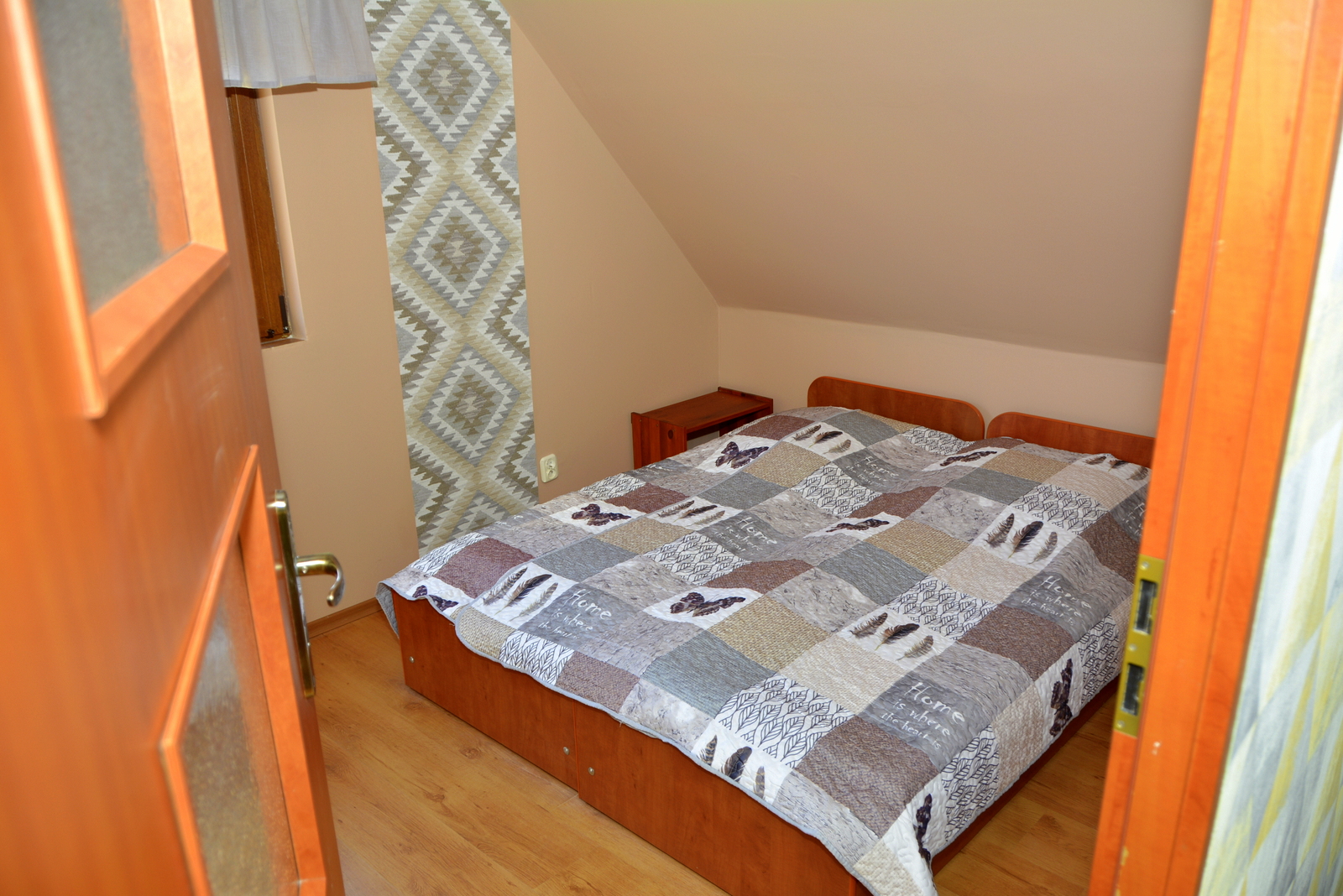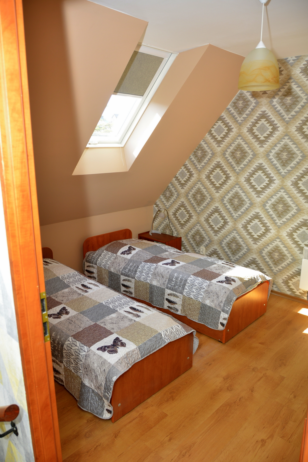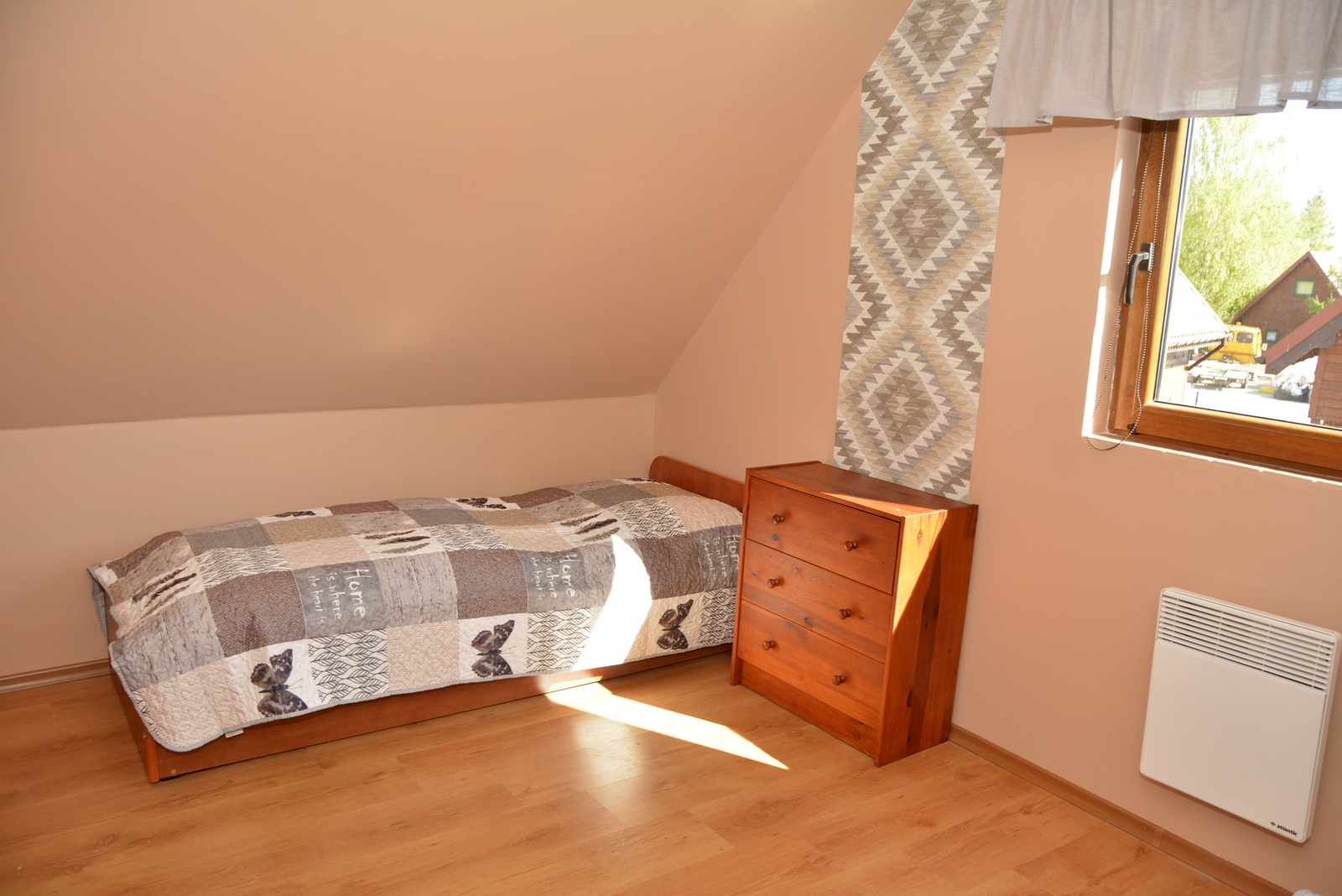 Na piętro wchodzi się po schodach, gdzie znajdują się dwie sypialnie, w każdej po trzy łóżka. w pokojach są szafki nocne.