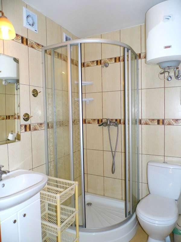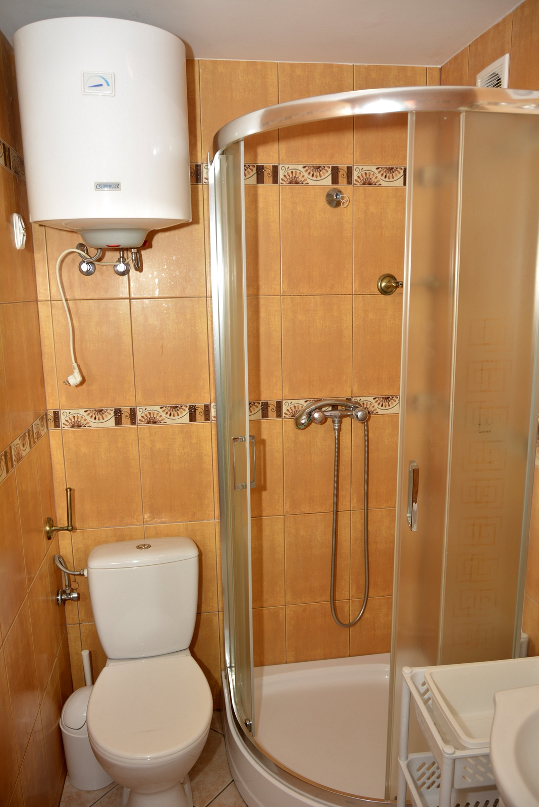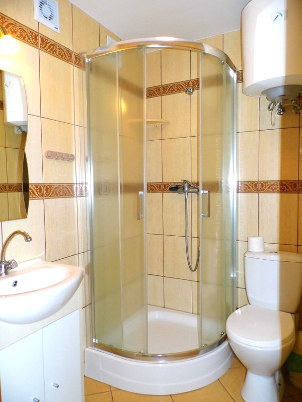 łazienka z umywalką , wc, prysznic ze szklaną kabiną natryskową .