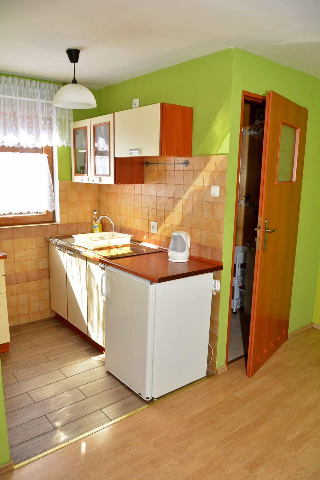 pełne wyposażenie kuchenne (garnki, patelnia, talerze, kieliszki,kubeczki i sztućce ).