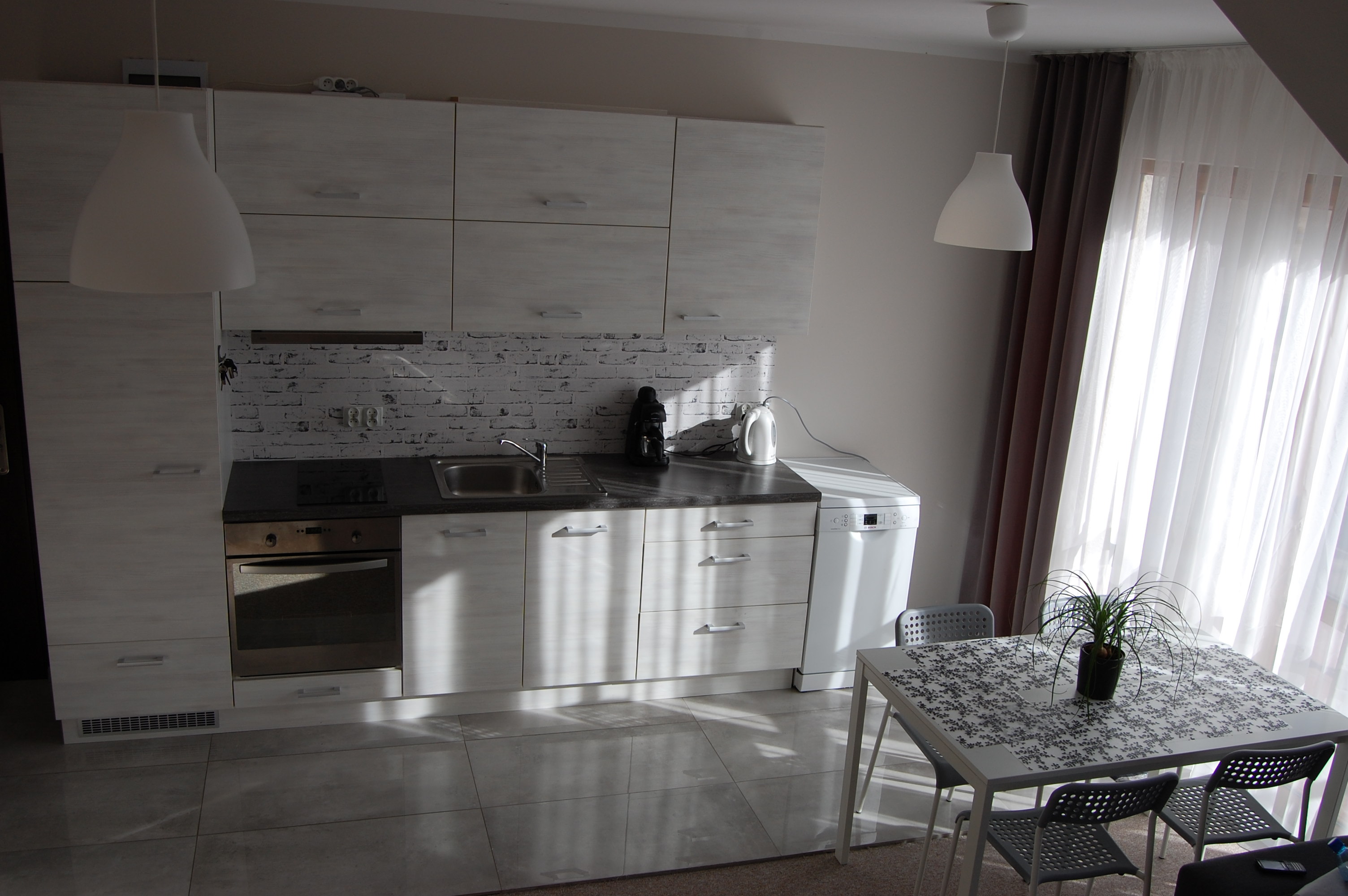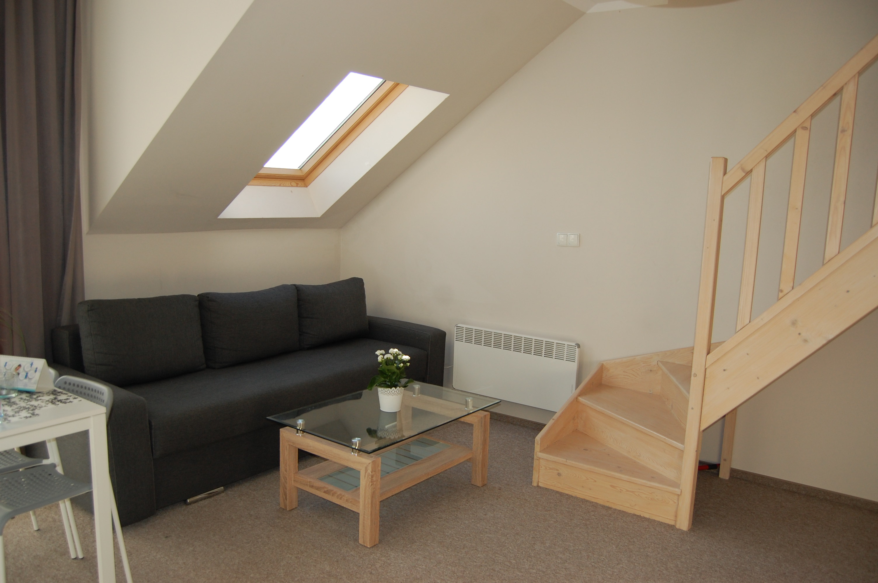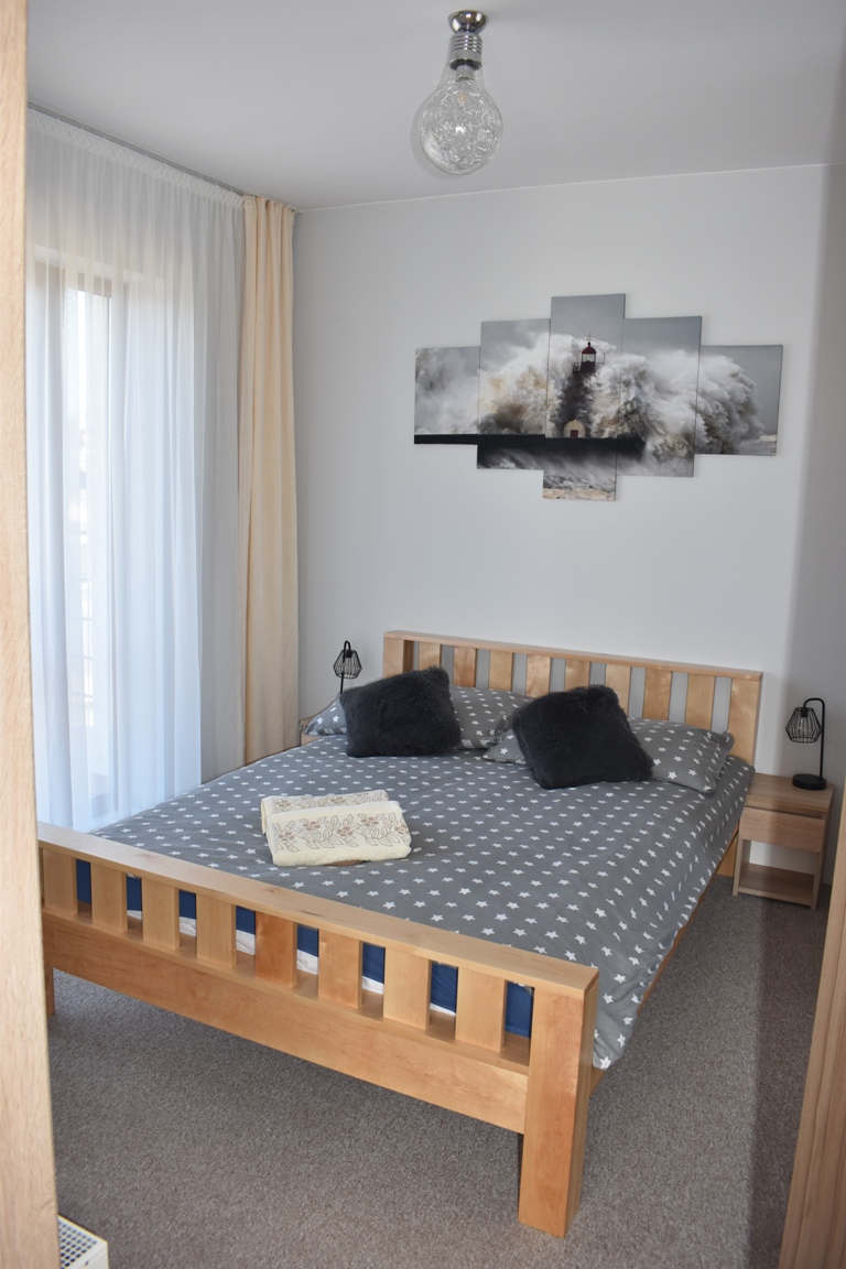 Mieszkanie składa się z salonu z aneksem kuchennym z balkonem, sypialni z balkonem, łazienki, oraz antresoli. Może pomieścić do 6 osób. Obiekt znajduje się w spokojnej dzielnicy miasta, odległość do plaży to około 1400 m (około 20 minut trasą spacerową), do najbliższego sklepu 600 m, przystanku PKP i PKS to ok. 1 km.