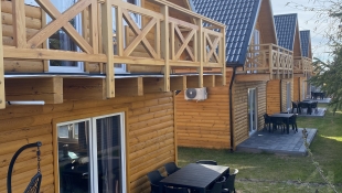 Nowo powstałe domki wypoczynkowe znajdujące się w miejscowości Żarnowska przy jeziorze Łebsko, 6 km od Łeby.
